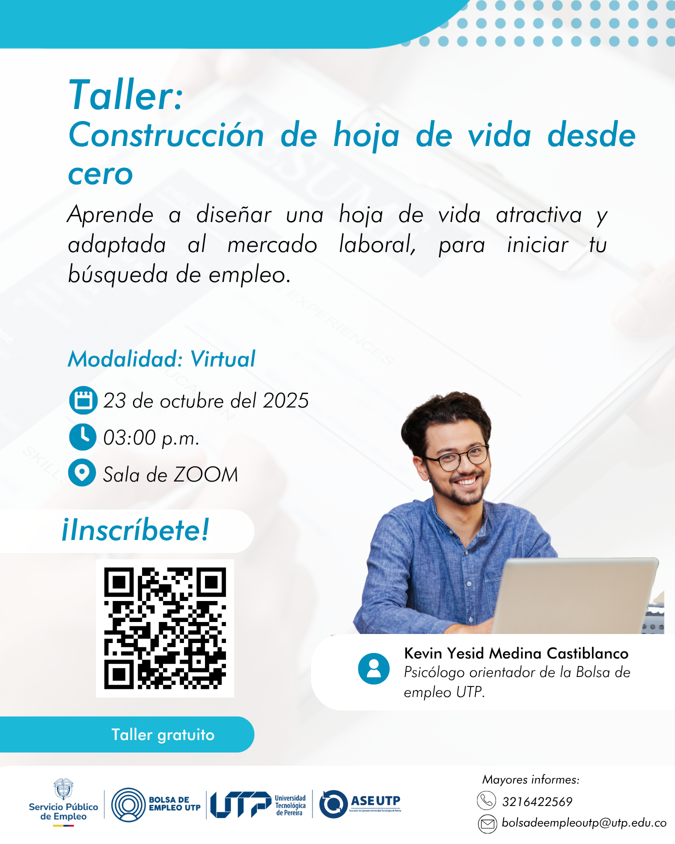 Fecha: 23 de octubre de 2025 Hora: 03:00 p.m. Lugar: Sala de Zoom Facilitador: Kevin Yesid Medina Castiblanco Modalidad: Virtual ¡Inscripción gratuita aquí! https://forms.gle/LLBCkto8eq8FkSo96 Más información: 3216422569 bolsadeempleoutp@utp.edu.co Nota: El taller es gratuito, se compartirá […]