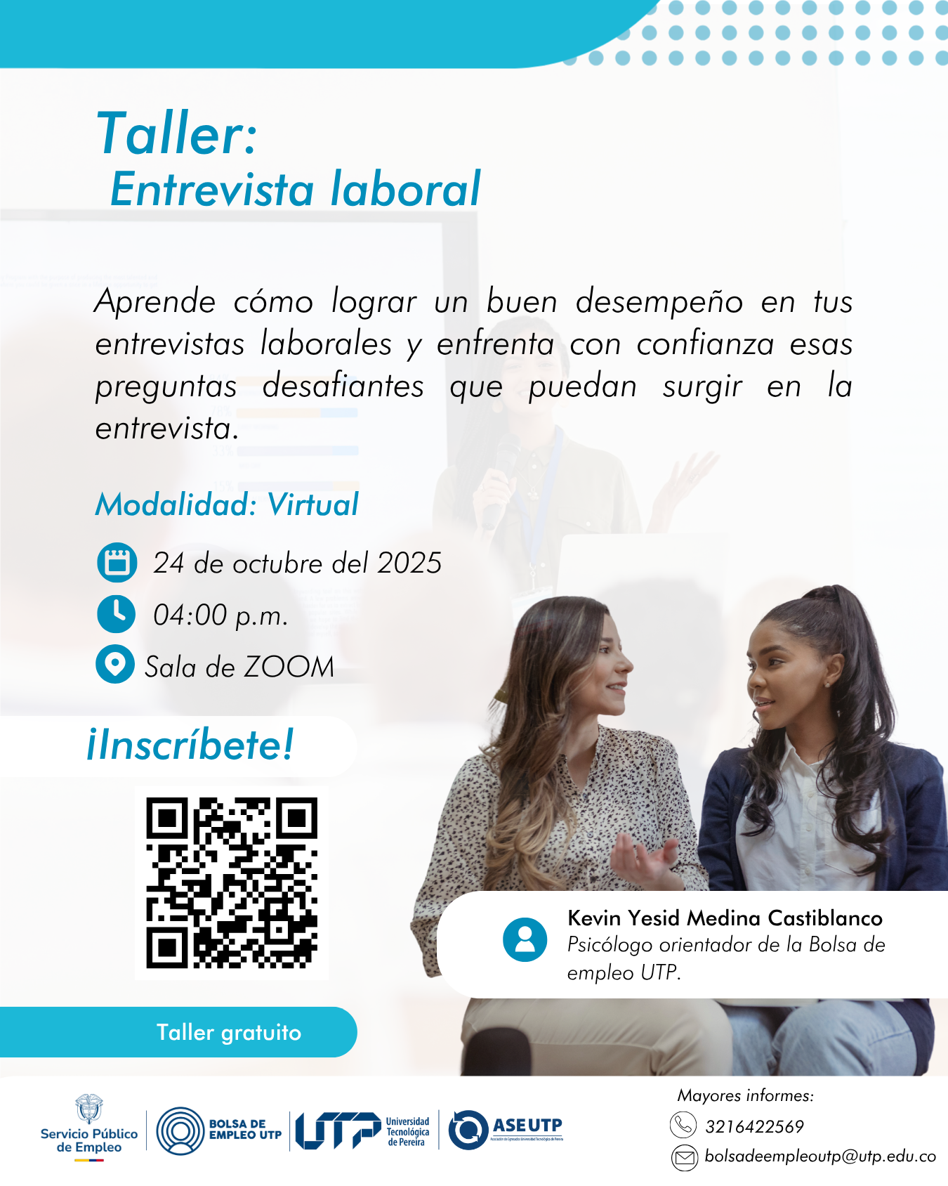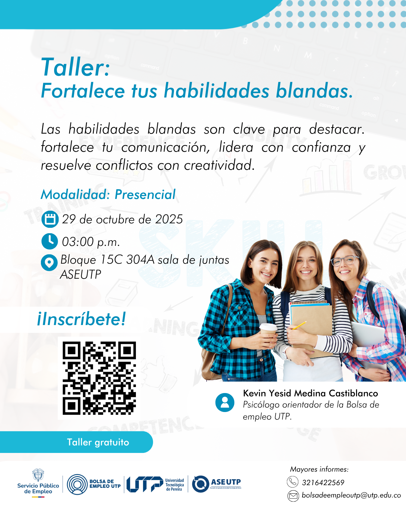 Fecha: 23 de septiembre de 2025 Hora: 04:00 p.m. Lugar: 15C 304A Sala de juntas ASEUTP Facilitador: Kevin Yesid Medina Castiblanco Modalidad: Presencial ¡Inscripción gratuita aquí! https://forms.gle/LLBCkto8eq8FkSo96 Más información: 3216422569 bolsadeempleoutp@utp.edu.co Nota: Cupos limitados […]