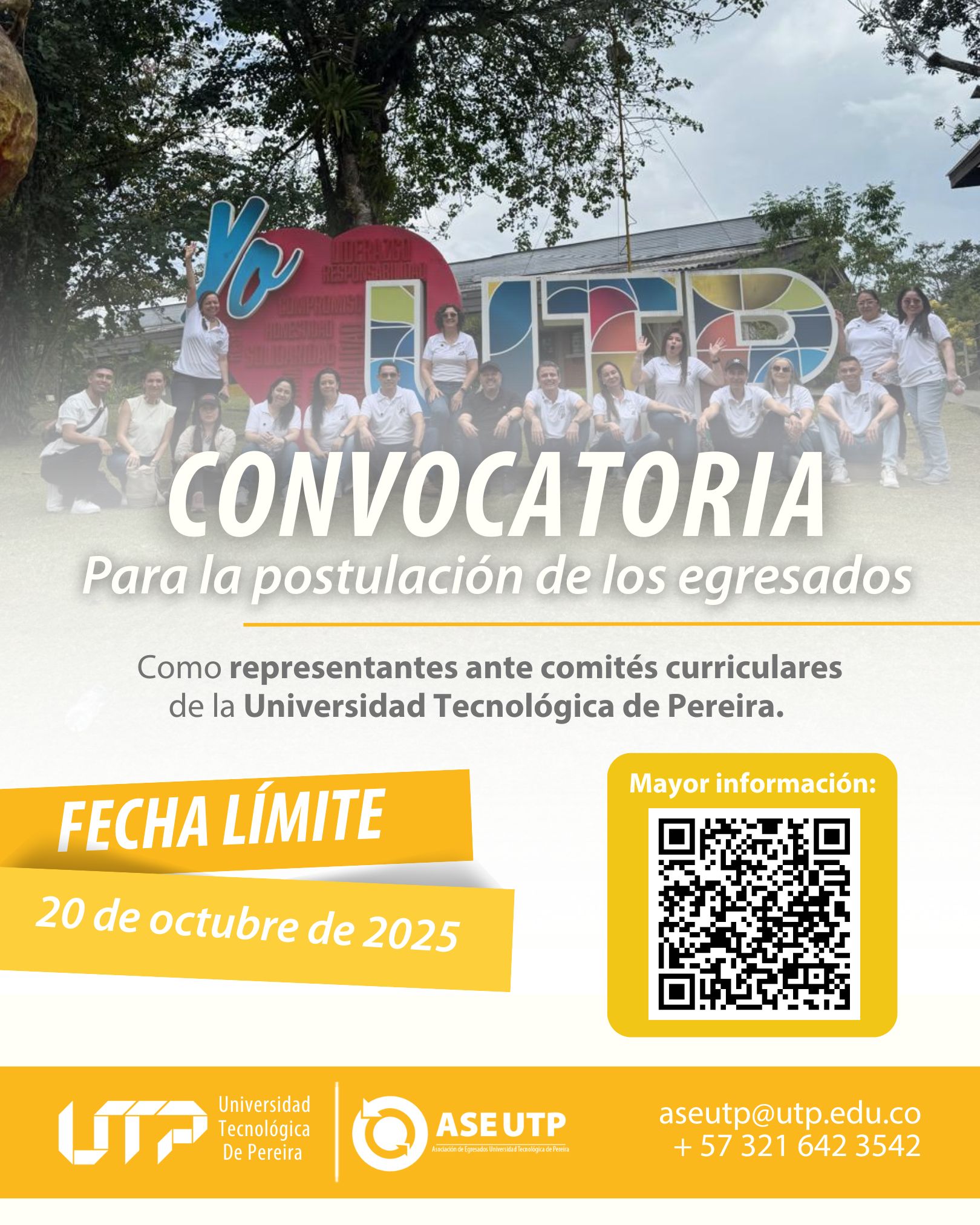 LA ASOCIACIÓN DE EGRESADOS DE LA UNIVERSIDAD TECNOLÓGICA DE PEREIRA CONVOCA A LOS EGRESADOS DE LA UNIVERSIDAD A POSTULARSE PARA LA REPRESENTACIÓN DE LOS EGRESADOS ANTE LOS SIGUIENTES COMITÉS CURRICULARES DE LA UNIVERSIDAD TECNOLÓGICA DE PEREIRA.